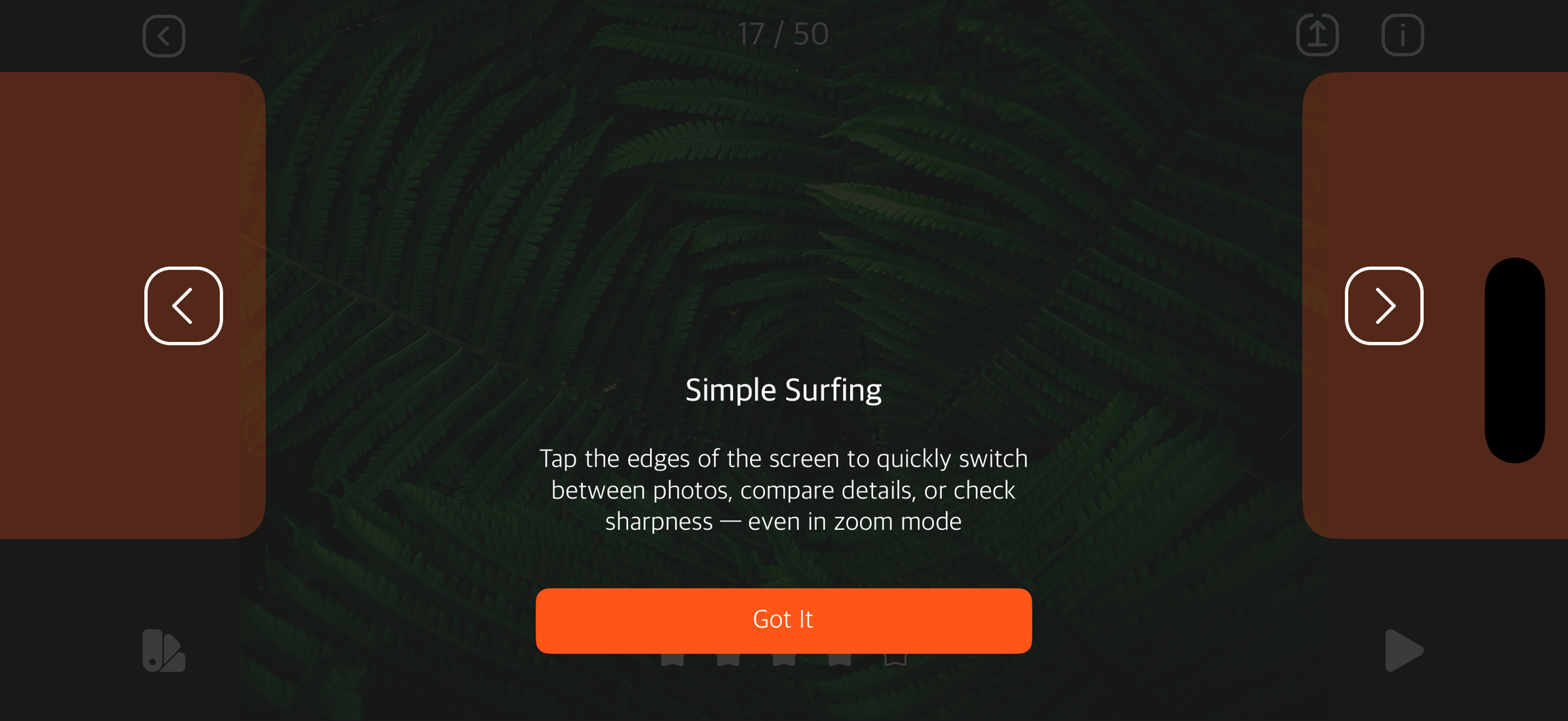 Schnelle Navigation zwischen Fotos: Beim Betrachten eines einzelnen Fotos können Sie durch Tippen auf die Bildschirmränder schnell zwischen den Bildern wechseln. Diese Funktion steht auch im Zoommodus zur Verfügung und ermöglicht es, Details bequem zu vergleichen und die Schärfe mehrerer Aufnahmen zu beurteilen.