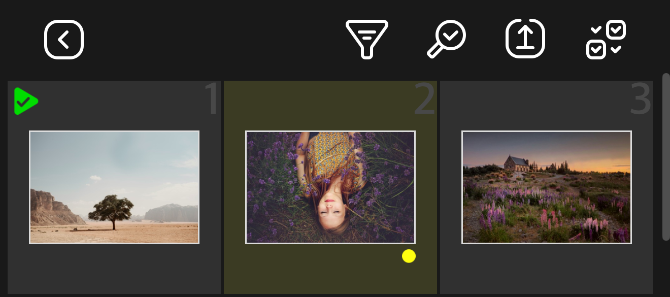 Gruppenauswahlmodus: Markieren Sie ein einzelnes oder alle Fotos und führen Sie Gruppenaktionen aus, wie das Setzen von Flags, Bewertungen oder Farbetiketten. Der Modus kann auch durch langes Drücken auf ein Bild aktiviert werden.