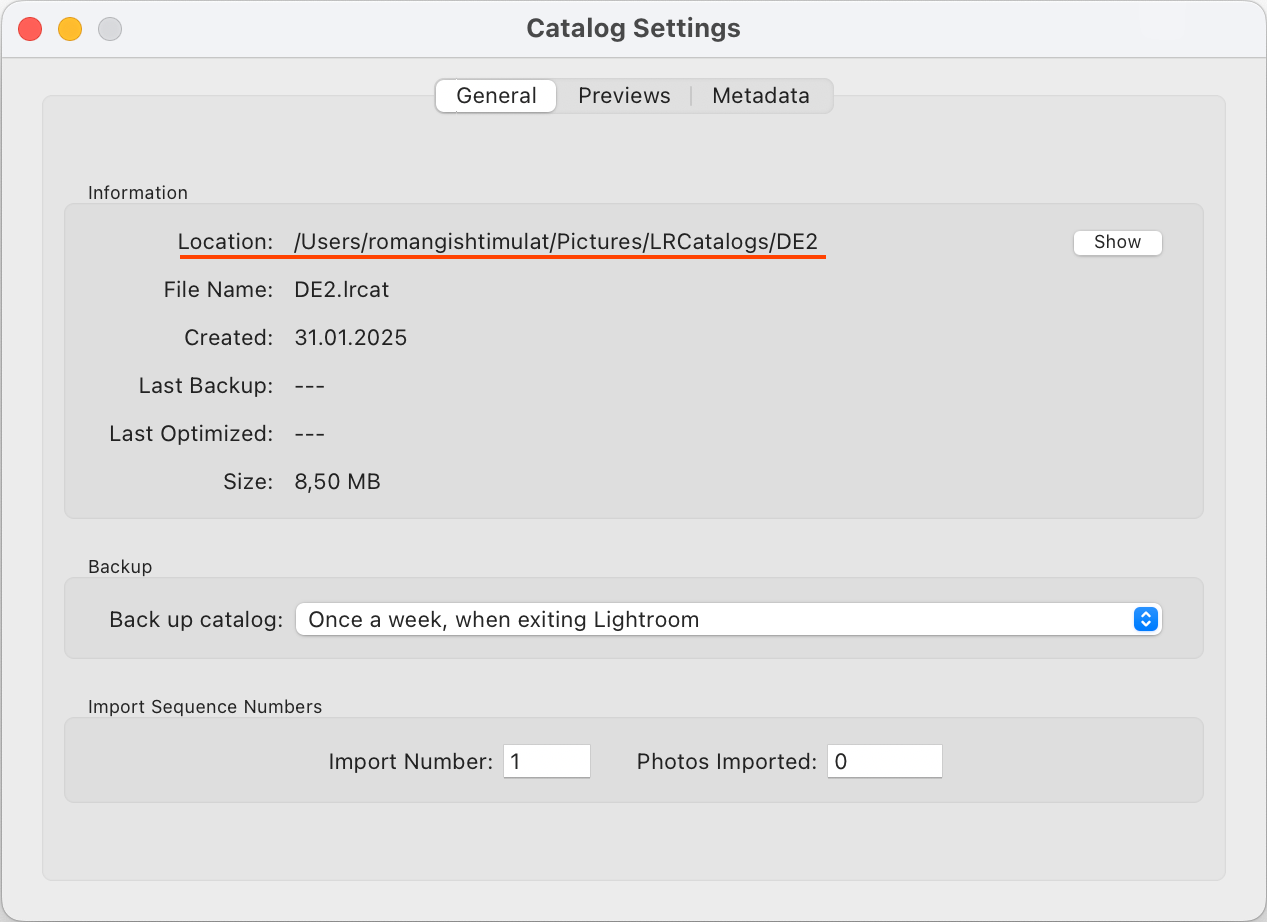 Para encontrar la ruta del catálogo actual, abre los ajustes del catálogo en Lightroom Classic: