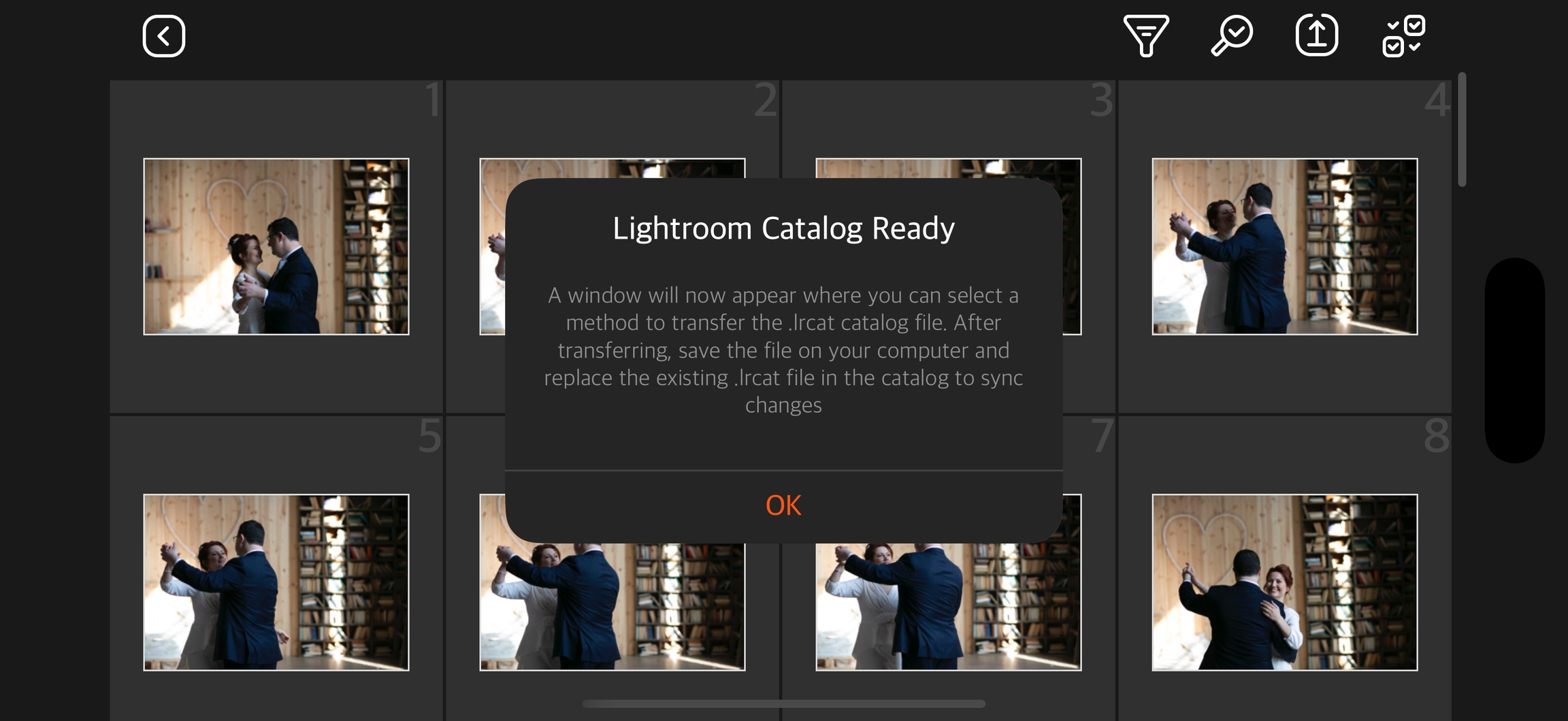 2. A window will appear prompting you to choose a method to transfer the .lrcat catalog file. Select the appropriate transfer method and send the file to your computer.