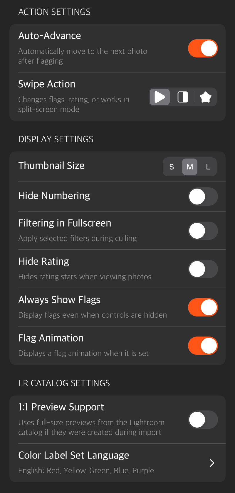 Swipe Action: Allows you to choose the swipe gesture’s function—control flags, ratings, or use a split-screen mode where swiping on the left controls ratings and swiping on the right controls flags